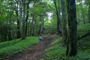 木々の緑がすがすがしい風景が広がる 船津登山道 |